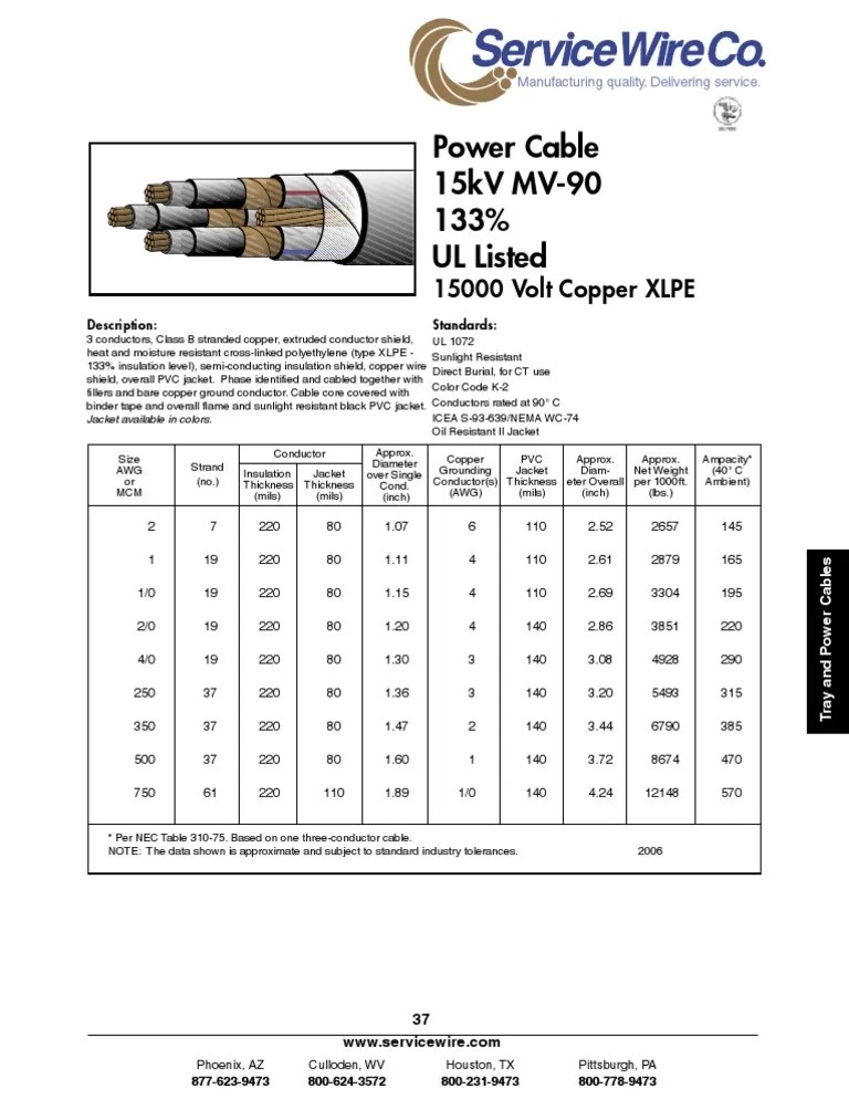 15KV MV105 Cable Specs Copper Conductor Data Sheet