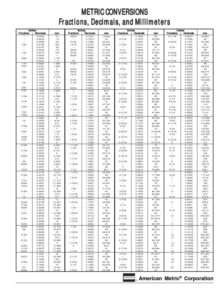 Easy to Read Fraction and Decimal to Metric Conversion Chart Inches and