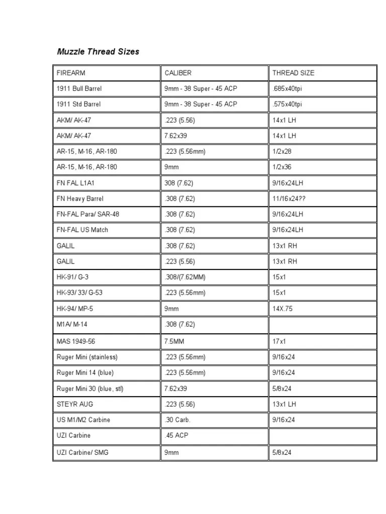 Muzzle Thread Sizes For Various Firearms PDF PDF Firearms Ammunition